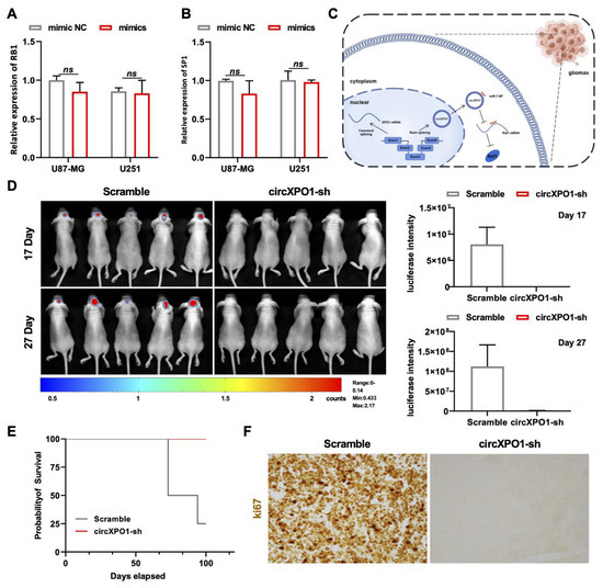 circXPO1 suppression inhibits GBM progression in vivo. (A,B) The expression of RB1 and SP1 was almost unaffected by miR-7-5p mimics. (C) Schematic representation of circXPO1-mediated GBM-promoting function. (D) Bioluminescent images of the intracranial tumors of nude mice (5 mice for each group) on day 17 and 27 post stereotaxic orthotopic implantation of GBM cells. (E) Survival curve of model mice transplanted with circXPO1-sh or scramble control GBM cells. (F) Immunohistochemical staining of Ki67 revealed major cell cycle inhibition in circXPO1-sh group.