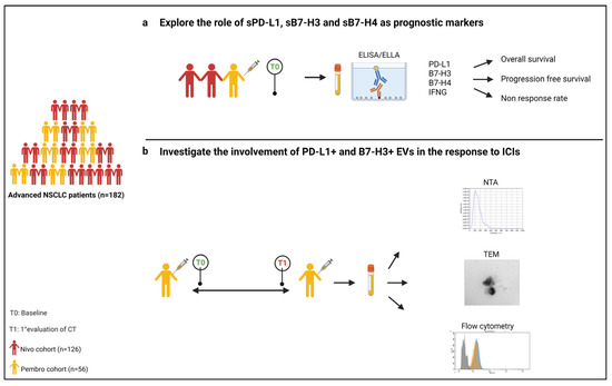 Study design: (a) explore the role of sPD-L1, sB7-H3 and sB7-H4 as prognostic markers in patients with advanced NSCLC treated with nivolumab or pembrolizumab; (b) assess the involvement of EVs expressing PD-L1 and B7-H3 in the mechanisms of the response to ICIs.