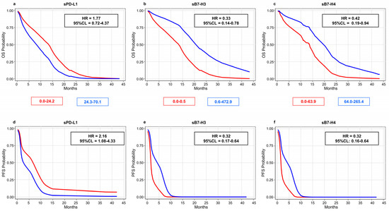 Overall (a–c) and progression-free (d–f) survival probabilities estimated through multivariable Cox regression analysis in 56 patients of Pembro cohort stratified according to biomarker median values: sPD-L1 = 24.2 pg/mL (a,d); sB7-H3 = 0.5 ng/mL (b,e); sB7-H4 = 63.9 pg/mL (c,f). Legend—HR: hazard rate ratio adjusted for gender, age, cycles of therapy, ECOG-PS and histotype; 95% CL: 95% confidence limits for HR.