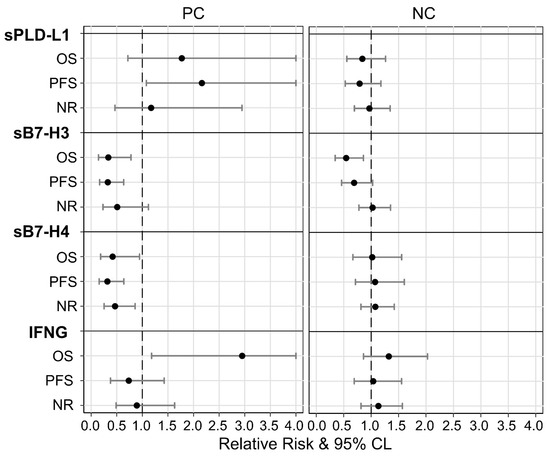 In addition, the association between soluble markers and RECIST-based disease response to ICI therapy was also investigated by comparing patients with a disease control response (complete/partial response, and stable disease) to non-responders (NRs, patients with progression and early death), using multivariable Poisson regression. Non-response rates were found to be generally independent from all soluble markers in both cohorts, although a non-statistically significant association with higher values of sB7-H3 (RR = 0.51; 95% CL = 0.23–1.12) and of sB7-H4 (RR = 0.47; 95% CL = 0.25–0.86) was detected in the PC (Table S5). Figure 3 summarizes the relative risks based on marker expression; notably, similar risk patterns in the three diverse outcomes were found only in the PC for sPD-L1, in which higher levels (sPD-L1 > 24.2 pg/mL) seemed to correlate to a higher risk (RR/HR > 1.0). Conversely, higher levels of both forms of sB7-H (sB7-H3 > 0.5 mg/mL; sB7-H4 > 63.9 pg/mL) appeared to play a protective role (RR/HR < 1.0).