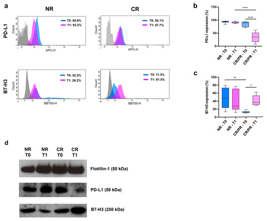 (a) Representative flow cytometry analysis of EVs derived from plasma of NR (#146) and CR (#174) patients, at both T0 and T1. Areas under blue and pink lines indicate EVs reacting with PD-L1 (upper panels) or B7-H3 (bottom panels) at T0 and T1, respectively. Areas under the grey lines indicate the interactions of vesicles with corresponding non-reactive immunoglobulin of the same isotype. (b,c) Histograms representing the percentage of PD-L1- (b) or B7-H3-positive EVs (c) derived from NR and CR/PR patients, at both T0 and T1. *: p < 0.05, **: p < 0.01, ****: p < 0.0001 (one-way ANOVA). (d) Western blot analysis of Flotillin-1, PD-L1 and B7-H3 on EVs derived from plasma of NR (#146) and CR (#174) patients, at both T0 and T1.