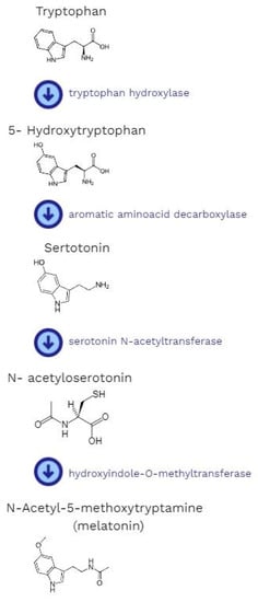 Melatonin is a neurohormone whose main source is the pineal gland [21]. The production of melatonin is dependent on the light/dark cycle. Interestingly, light can either suppress or initiate melatonin synthesis [22,23]. When it is received by the retina, the signal is sent to the suprachiasmatic nuclei of the hypothalamus [24]. Later, it goes through the upper part of the cervical spinal cord, where the synapses, which are connections with preganglionic cell bodies of the superior cervical ganglia, are located. Finally, it reaches the pineal gland. The signal is mainly transmitted by a neuromediator called norepinephrine [22]. It binds with beta-adrenergic receptors and stimulates the pineal gland to produce melatonin [24]. The synthesis starts with the hydroxylation of the amino acid tryptophan (by tryptophan-5-hydroxylase) to 5-hydroxytryptophan, then decarboxylation (by 5-hydroxytryptophan decarboxylase) to serotonin. This is followed by the acetylation of serotonin to form N-acetylserotonin (by arylalkylamine-N-acetyltransferase). The concluding stage is the methylation of N-acetylserotonin by acetylserotonin-O-methyltransferase. After all above-mentioned reactions, it is possible to obtain the final product, which is melatonin [17] (Figure 1).