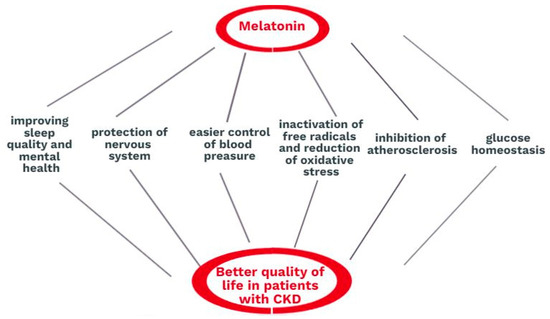 Melatonin has both direct and indirect influences on the well-being of patients with CKD. Firstly, it regulates the day and night cycle and maintains the proper quality of sleep. Sleeping disorders lead to depression and behavioral complications. Deficient sleep is connected to physical weakness, an increased level of aggression, and attention disorders. It also restricts the social life and personal development due to memory deterioration or reductions in performance on physical examinations. Furthermore, abnormalities in melatonin production or secretion are connected to pathologies of the nervous system, such as Alzheimer’s and Parkinson’s diseases. Besides controlling the circadian rhythm, the melatonin profile in human physiology has certain additional effects related to the glucose balance, the control of blood pressure, phosphocalcic metabolism, and hemostasis. The process of kidney degeneration is often an implication of the frequent prevalence of arterial hypertension, diabetes mellitus, atherosclerosis, and obesity. Melatonin has been proven to have beneficial effects in all of these complications. Melatonin also plays a direct renoprotective role. Moreover, it can be helpful in almost every type of kidney injury because inflammation, apoptosis, and oxidative stress occur without regard to the mechanism. Melatonin regulates mitochondrial metabolism and ATP production and protects mitochondria. It inactivates free radicals by attaching one or more electrons and thus reduces oxidative stress. Due to these mechanisms, melatonin enables normal mitochondrial functions and protects patients from subsequent apoptotic implications and the death of kidney cells. The role of this hormone in kidney disease is summarized in Figure 3.