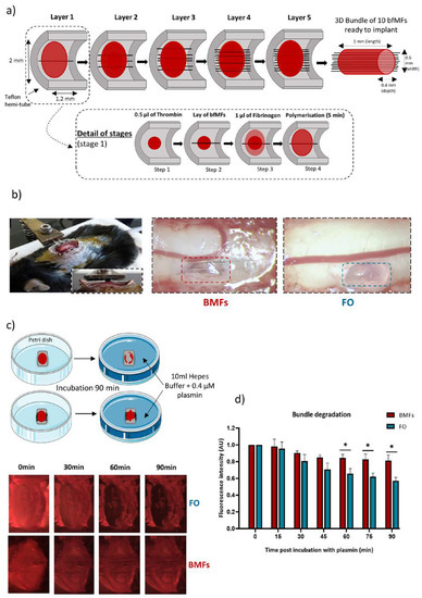 Prior to their intravital implantation, an in-vitro study was conducted to evaluate the robustness of such implants to enzymatic degradation by plasmin at room temperature and at 37 °C to mimic intravital conditions. FO and BMFs implants were incubated for 90 min in a bath containing 0.4 μM of plasmin (Sigma; P1867; 3.9 units/mg) diluted in HEPES buffer (Figure 1c). Sulforhodamine indicator (1 mg/mL) was added to the thrombin and fibrinogen solutions prior to mixing. To evaluate the degradation, trapped fluorescence intensity inside the red bundle was monitored every 5 min for 90 min as an index of fibrin digestion. Images taken at regular intervals following the immersion into the plasmin bath (Figure 1c) showed that the FO were degraded over time while the BMFs seemed comparatively stable. The quantification of fibrin degradation by plasmin in both FO and BMF conditions is presented in Figure 1d. We found that more than 40% of the total fibrin was digested within 90 min incubation in plasmin. However, inclusion of a MF scaffold inside the fibrin implant reduced its sensitivity to plasmin digestion by a factor of 2, with fluorescence declining only by 20% over 90 min. These data suggested that the MFs would slow down the resorption of the fibrin gel in vivo.