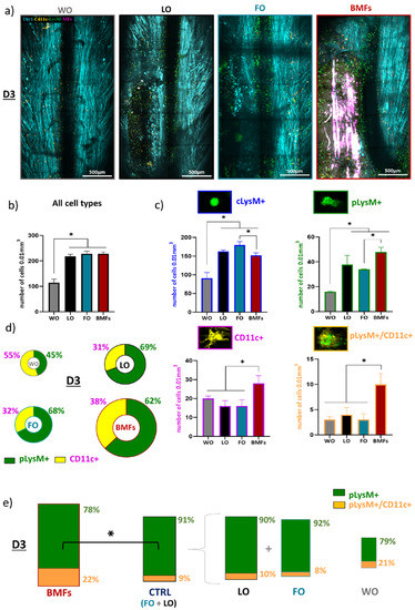 However, the most striking effect of the presence of MFs at this post-traumatic stage was the increase by a factor of 3 in the densities of pLysM+/CD11c+ moDC cells (BMFs:10 ± 2 cells/vol versus FO: 3 ± 1 cells/vol, Figure 2c), which accounted for 22 ± 4% of all infiltrated pLysM+ cells in BMFs animals instead of 9 ± 3% of pLysM+ cells in control animals (FO and LO) (Figure 2e).