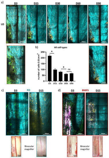 In order to assess the role of fibrin-based implants on the dynamics of early post-traumatic inflammatory processes occurring early after PUDQL, we first quantified immune cell numbers and densities on 2P intravital images obtained at three days (D3) after surgery in BMFs, FO, LO, and WO Thy1-CFP//LysM-EGFP//CD11c-EYFP triple transgenic mice (Figure 2a).