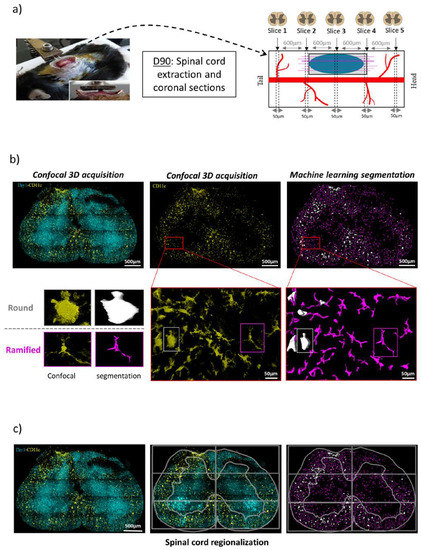 Ninety days after PUDQL (D90) mice were perfused with 4% paraformaldehyde. Then, spinal cords were removed, post-fixed overnight in 4% paraformaldehyde, and cut into 50 µm thickness coronal sections and 100 µm thick sagittal sections using a vibratome (Leica Microsystem, Rueil-Malmaison, France). Spinal cord slices were then mounted on glass slides with coverslip. Imaging was performed on a Carl Zeiss LSM780 confocal microscope using the 458 nm and 514 nm wavelengths to excite the CFP-Thy1+ and EYFP-CD11c+ signals; detection was obtained using 469–516 and 517–544 nm band pass filters, respectively. Tiled-stack images were acquired with an optical sectioning of 5 µm over a depth of 25 µm. Late-stage inflammation, referred to as chronic inflammation [7], was thus evaluated from a set of five coronal 50 µm thick slices centered on the lesion epicenter and spreading rostro-caudally over 2.4 mm at 600 µm intervals in 2 animals per condition.