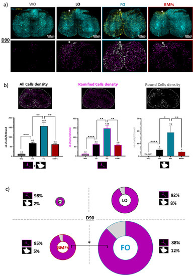 Furthermore, the inflammatory environment of the BMF animals was similar to that of the LO animals (Figure 5a–c). MFs were then able to counteract the chronic inflammation normally observed in FO animals. In addition to the quantity of cells, observations (Figure 5a) clearly revealed a distinct spatial distribution of CD11c+ cells relative to the lesion site between the LO, BMFs, and FO mice. Then, based on the machine learning segmentation (Figure 4b,c), we precisely assessed the round and ramified CD11c+ cell distributions in the spinal cord.