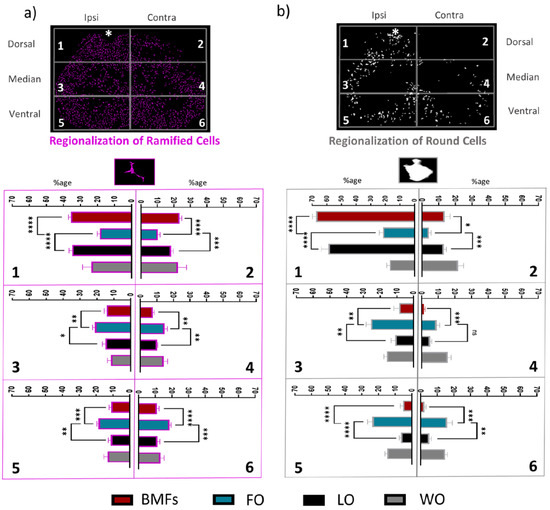 Dorsal and ipsilateral regionalization of chronic inflammation on D90 post lesion. (a) For each of the six rectangle ROIs, percentage of the total number of ramified CD11+ cells present in the section in each condition. (b) Same as (a) for round CD11+ cells. The white star indicates the lesion site. Results are displayed as mean ± SEM, n = 10 and * p < 0.05, ** p < 0.01, *** p < 0.001, **** p < 0.001.