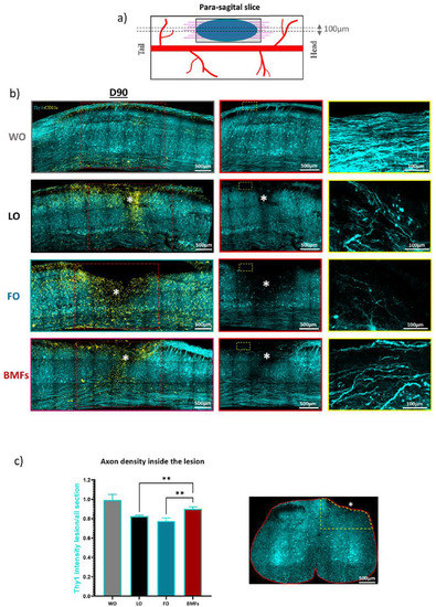 At the level of axons, a larger and deeper lesion site was visible at D90 in the FO animal compared to the milder lesions observed in both LO and BMFs animals. Higher magnification images further highlighted the sparseness of axons inside the FO lesion instead of the numerous though tortuous axons seen at D90 in the LO lesion (Figure 7b zoom). In BMF’s lesion, axonal density was highest despite the presence of fibrin; axons furthermore appeared straighter and more longitudinally oriented, contrary to the LO condition.