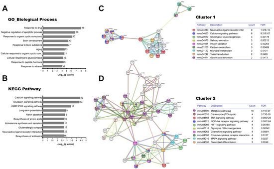 Transcriptomic dysregulation in hind paw footpads at 24 h post-Complete Freund’s Adjuvant injection. The lists of the differentially expressed genes (Z-score ≥ 1.5 SD) by CFA at 24 h were analyzed on the DAVID Bioinformatics Resources 6.8 (https://david.ncifcrf.gov/ accessed on 10 January 2023; (A,B)), STRING 11.5 database (https://string-db.org/ accessed on 10 January 2023) and Cytoscape 3.9.1 platforms (C,D). The top 10 Gene Ontology (GO) Biological Process (A) and the Kyoto Encyclopedia of Genes and Genomes (KEGG) pathways (B) resulting from the DAVID database are shown in bar charts indicating the −Log10 (p-value) of each GO and KEGG term. The number of genes involved in each term is shown on the right side of each bar. From the protein-protein interactions network of deregulated genes, the first (C) and second (D) clusters of sub-networks were obtained using the Molecular Complex Detection (MCODE) complement (cutoff = 0.4). The KEGG signaling pathways relevant to arthritis were selected (Tables) and marked with different colors. Line color indicates the type of interaction evidence. FDR: False discovery rate.