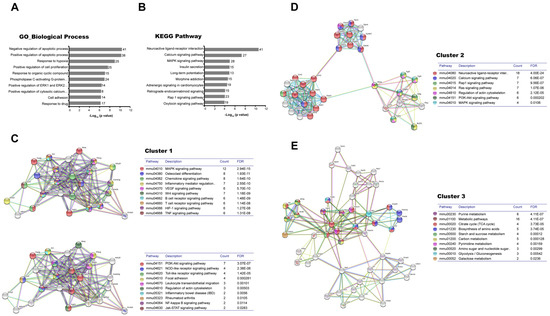 Transcriptomic dysregulation in hind paw footpads at 48 h post-Complete Freund’s Adjuvant injection. The lists of the differentially expressed genes (Z-score ≥ 1.5 SD) by CFA at 48 h were analyzed on the DAVID Bioinformatics Resources 6.8 (https://david.ncifcrf.gov/ accessed on 10 January 2023; (A,B)), STRING 11.5 database (https://string-db.org/ accessed on 10 January 2023) and Cytoscape 3.9.1 platforms (C,D). The top 10 Gene Ontology (GO) Biological Process (A) and the Kyoto Encyclopedia of Genes and Genomes (KEGG) pathways (B) resulting from the DAVID database are shown in bar charts indicating the −Log10 (p-value) of each GO and KEGG term. The number of genes involved in each term is shown on the right side of each bar. From the protein-protein interactions network of deregulated genes, the first (C), second (D), and third (E) clusters of sub-networks were obtained using the Molecular Complex Detection (MCODE) complement (cutoff = 0.4). The KEGG signaling pathways relevant to arthritis were selected (Tables) and marked with different colors. Line color indicates the type of interaction evidence. FDR: False discovery rate.