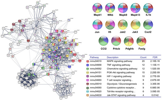 The genes of clusters 1 and 2, both at 24 h and 48 h, were selected and analyzed in the STRING platform to construct the IPP network and highlight the related KEGG pathways at the earliest stages of the AA model. Figure 3 shows several pathways linked to RA, including HIF-1, TNF, MAPK, Chemokine, T-cell receptor, Jak-STAT, and Glycolysis/Gluconeogenesis, were associated with these genes. In addition, Mapk proteins (1 and 13) linked several protein circuits, and the Il1b was also a link between MAPK, TNF, TLR, and Cytokine-cytokine receptor interaction signaling pathways.