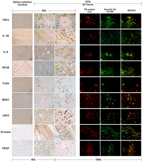Compared with saline solution-injected footpads, at 24 h in the CFA-injected, the TNFα, IL-1β, IL-6, NF-κB, MEK-1, JAK-3, Eno, and VEGF proteins were overexpressed. The IHC showed that different types of cells expressed these markers; therefore, we performed the colocalization staining using a fibroblast marker. Our IIF confirmed that the footpad’s resident fibroblast expressed the markers of interest, suggesting their phenotype transformation resembling descriptions of FLS.