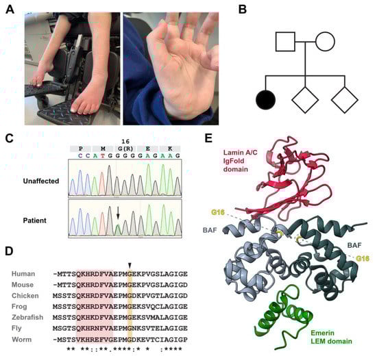 Identification of a de novo BANF1 mutation. (A) Photographs of hands and lower extremities of patient at 17 years, showing diffuse muscle weakness affecting legs. Contracture and drop of the feet are evident. Hand contractures are also observed. (B) Pedigree of the patient family, wherein the affected individual is shown as the black circle and unaffected individuals are shown as open shapes. (C) Direct sequence analysis of genomic DNA extracted from control and patient fibroblasts, confirming the heterozygous c.46G to A substitution (black arrow). (D) Sequence alignment of the first 28 residues of human BAF to the orthologs of the indicated species. Identical (*) and chemically similar (:) amino acids are noted below. The position of the mutated Gly is shown by the arrowhead above the alignment. The position of helix α1 is shown by the red background. (E) Crystal structure of the complex between the BAF dimer (monomers shown in light and dark grey), the lamin A/C IgFold domain (red) and the emerin LEM domain (green). The position of the mutated Gly in each BAF monomer is indicated. The PDB reference of this 3D structure is 6GHD.