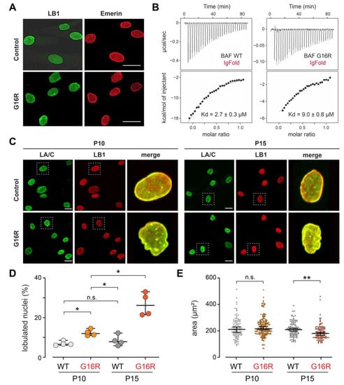 Reduced LA/C association with BAF Gly16Arg confers modest nuclear shape changes. (A) Confocal microscope images of control and patient passage 10 fibroblasts stained for lamin B1 (LB1; green) and emerin (red). Scale bars are 20 µm. (B) ITC titration analyses providing the affinity of BAF WT and BAF Gly16Arg for the lamin A/C IgFold domain. The experiment was repeated twice, and the dissociation constants represent the mean values calculated from these experiments (see Supplementary Figure S2). (C) Confocal microscope images of control and patient passage 10 and 15 fibroblasts stained for lamin A/C (LA/C; green) and lamin B1 (LB1; red). An enlarged image of the boxed nucleus is shown on right hand side of panel. Scale bars are 20 µm. (D,E) Graphs of changes in (D) shape and (E) nuclear area at P10 and P15. For nuclear shape, nuclei were scored as lobulated if they contained >1 lobulation []. Determinations were made using a double-blind approach, followed by averaging four data sets. For each coverslip, 100 nuclei were scored. Averages were compared using the Mann–Whitney test for non-parametric data. * p < 0.05. For nuclear area, measurements were made on 100 nuclei plated on two independent coverslips using CellProfiler software []. Means were compared using the unpaired t-test. ns = not significant, ** p < 0.01.