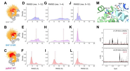 The structure of helix α1 in BAF Gly16Arg is less variable than in BAF WT. (A–C) Superimposition of a set of 6000 monomeric structures extracted from the MD trajectories of BAF WT (BAF; []), BAF Gly16Arg and di-phosphorylated BAF WT (ppBAF; []). Residues 20–89 are colored in grey and residues 1 to 19 are colored in orange except for residues 5 to 12 (transiently forming helix α1) that are colored in red. The structures were superimposed on the core region of the reference BAF crystal structure 1CI4 (helix α3, α4, α5 and α6) by minimizing the RMS deviation of the Cα coordinates of the extracted structures with respect to the ones of the reference structure. (D–F). Dispersion of the structures of the N-terminal region (residues 1 to 12) is represented by plotting the distribution histograms (in density mode) of the RMS deviations (RMSD) of the Cα of residues 1 to 12 with respect to the reference structure 1CI4. (G–I) Dispersion of the structures of the N-terminus (residues 1 to 4) is represented by plotting the same distribution histograms calculated on residues 1 to 4. (J–L) Dispersion of the structures of residues forming helix α1 (residues 5 to 12) is represented by plotting the same distribution histograms calculated on residues 5 to 12. The vertical red dotted lines show the median value of these distributions. (M) A representative frame extracted from the MD simulation of BAF Gly16Arg is displayed, with each BAF monomer being colored in light blue and green, respectively (N-terminal regions from residues 1 to 12 in dark blue and green, respectively). The Arg16 and Leu89 residues are displayed in ball-and-stick. The position of the MD simulation-identified salt-bridge is visualized by a black line between the guanidinium group of Arg16 of one monomer and the C-terminal carboxyl group of Leu89 of the other monomer. (N) Plots of the distance between the guanidinium group of Arg16 of one monomer (A, B) and the C-terminal carboxyl group of Leu89 of the other monomer (B, A) along one of the 1 µs MD trajectories. This distance is mostly constant along the three 1 µs MD trajectories calculated for BAF Gly16Arg.