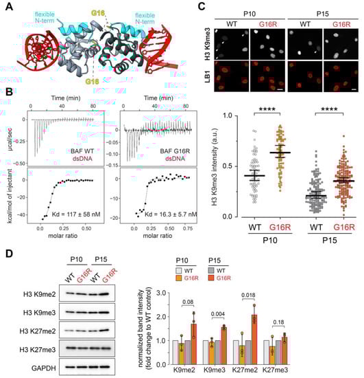 Each BAF monomer binds DNA (Figure 5A), leading to DNA cross-linking by the dimer [,]. Building from the observations of increased DNA binding affinity in the BAF Gly16Arg, we postulated that expression of the Gly16Arg variant might increase chromatin compaction in vivo, evidenced by expansion of heterochromatin. To this end, we stained patient and control fibroblasts with antibodies against tri-methylated lysine 9 on histone H3 (H3K9me3), a histone post-translational modification uniformly associated with heterochromatin. We observed significant increases in H3K9me3 in both early and later stage passages (Figure 5C). To extend these observations, we performed Western blot analyses on proteins extracted from early and late-stage cell passages. Specifically, we investigated the levels of H3K9me2, H3K9me3, H3K27me2, and H3K27me3, with these latter two types of histone post-translational modifications associated with facultative heterochromatin. These analyses showed increased levels of H3K9me3 and H3K27me2 in late passage (P15) BAF Gly16Arg fibroblasts (Figure 5D, Supplementary Figure S4). Our findings suggest that the increased DNA binding affinity of BAF Gly16Arg leads to an altered chromatin occupancy in vivo, resulting in an aberrant epigenetic landscape. Notably, these findings differ from those observed in NGPS and HGPS cells that carry a lamin A/C mutation [,,], emphasizing differences in the effects of BAF Gly16Arg and mutations that lead to progeroid diseases.