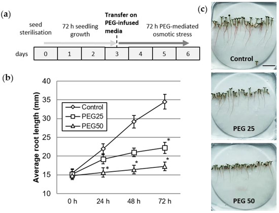 Plant growth under control and osmotic stress conditions. (a) Schedule of seedling culture and osmotic stress application. (b) Root growth kinetics of seedlings grown for 72 h under control and PEG-mediated osmotic stress conditions. Mean and standard error from six biological replicates (10 plants per replicate). * indicates significant difference with the control at level alpha = 0.05 according to Kruskal–Wallis test with Dunn’s procedure. (c) Six day-old seedlings after 72 h growth under control, moderate (PEG25), or strong (PEG50) osmotic stress conditions (bar scale: 2 cm).