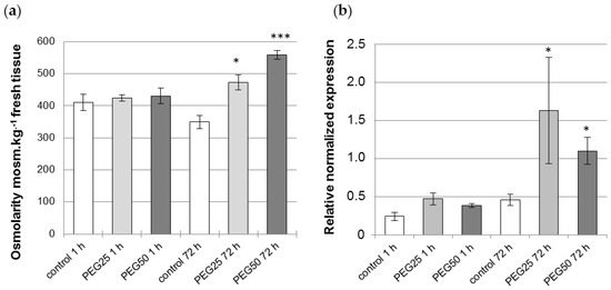 The plant osmolarity did not change after 1 h in the control or when osmotic constraint was applied (Figure 2a), but increased significantly after 72 h, by 1.4- and 1.6-fold in comparison with the control in response to intermediate (PEG25) and strong (PEG50) osmotic stress, respectively. In the same way, P5CS2 gene expression was also found to be significantly enhanced, by 3.5- and 2.4-fold, under intermediate and strong osmotic stress, respectively, as compared to the control (Figure 2b).