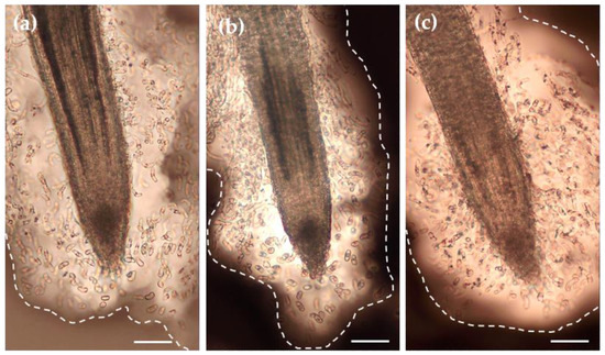 Microscopic observation of the RET of root tips of the control (a) and stressed (b,c, PEG25 and PEG50, respectively) seedlings using India ink contrast staining. Root tips were collected on day 6 after 72 h of osmotic stress. The images show a significant amount of mucilage (delimited by the dotted line) embedding AC-DCs. Bar scale: 100 μm.