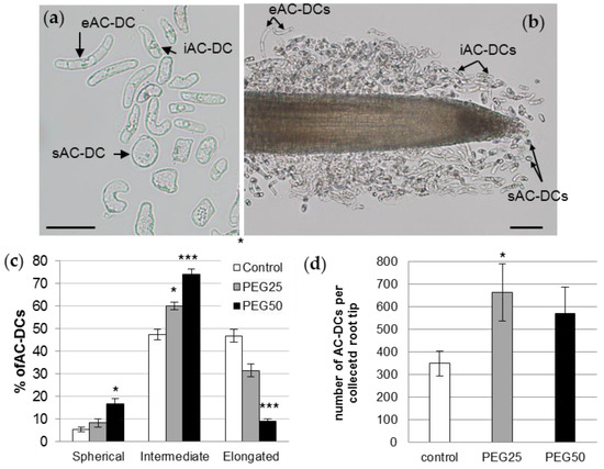 Regarding the proportion of each morphotype, the control root AC-DC populations consisted of 5.6% sAC-DCs, 47.5% iAC-DCs, and 46.9% eAC-DCs (Figure 4c). These proportions varied considerably in response to the strong osmotic stress (PEG50). The proportions of sAC-DCs and iAC-DCs increased significantly (16.9% and 73.9%, respectively), while eAC-DCs proportions decreased by 5-fold (9.2%) compared to the control. The application of moderate stress (PEG25) resulted in intermediate proportions of AC-DCs (8.3% sAC-DCs, 60.2% iAC-DCs, and 31.5% eAC-DCs). The average number of AC-DCs collected per root (all morphotypes together) was calculated for each of the experimental conditions. While an average of 350 AC-DCs was collected from the control roots, this number increased to 664 (significant at alpha = 0.05) and 570 under the PEG25 and PEG50 conditions, respectively (Figure 4d).