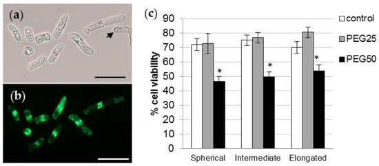AC-DC viability was analyzed using FDA probe fluorescence (Figure 6a,b). Under control conditions, the percentage of cell viability (Figure 6c) was at least 70% (72.3, 75.2, and 70% for sAC-DCs, iAC-DCs, and eAC-DCs, respectively). The viability of AC-DCs was not affected by the application of moderate stress (PEG25), but was significantly reduced to approximately 50% for all morphotypes after 72 h under conditions of strong osmotic stress (PEG50) (46.5, 49.7, and 54% for sAC-DCs, iAC-DCs, and eAC-DCs, respectively).