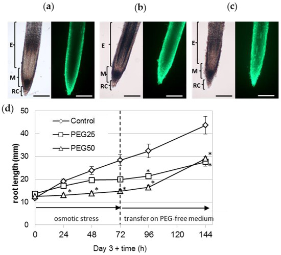 The survival of the root tip (meristematic and elongating zones) was also assessed using the FDA probe. Detailed observations of several roots under the microscope showed that a large number of cells from the root cap, meristematic zone, and elongation zone were viable, regardless of the experimental condition (Figure 7a–c). The survival of the root tip was also evidenced by transferring 6 day-old stressed seedlings to ½ MS control medium for a further 72 h period (Figure 7d). Stressed seedlings regained a growth rate nearly comparable to that of the control seedlings (5.1, 2.5, and 4.8 mm per day for control, PEG25 and PEG50 stressed seedlings, respectively).