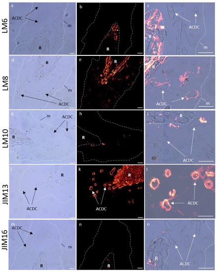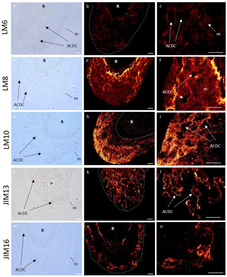 Cell walls from meristematic and elongation zones only presented labeling for JIM8 and JIM13 (Figure S3). JIM14, JIM16, or extensin epitopes recognized by JIM12 and LM1 showed no fluorescence signal (Figures S3 and S4).