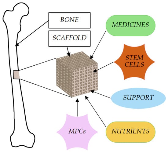 Scaffolds can be filled with medicines, which are then released locally at the site of scaffold implantation [61] (Figure 1). There is a wide range of materials used in bone tissue engineering, e.g., gypsum, ceramics, resin, and plastics [62,63,64,65,66]. Additionally, the bio-ink ensures the proper regeneration and reconstruction of bone tissue. The resulting material largely corresponds to the morphological features of normal human tissue [67]. The advantage of the entire process is the ability to adjust all parameters to the patient’s needs and, consequently, to improve the condition of life [45].