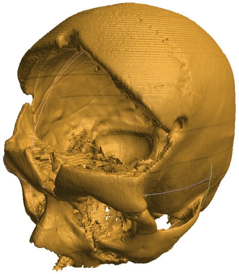 The process of implant preparation can be divided into several steps. The initial stage is collecting data on the defective bone using CT and MRI [141,142]. Through programs such as 3D doctors, 3D slicer, etc., the data are converted into 3D CAD. This is later used as a base for implant creation, as the resulting object must fit exactly in the area in question. This requires the use of graphic design tools and can vary between cases. Currently, the process of model creation is simplified and can be performed using easy to use and free software that creates models that need very little processing before slicing and printing [16]. Nevertheless, the automated algorithms can sometimes struggle when processing complex, low-quality, or noisy images. The skull, especially when damaged in the face area, can be quite challenging and requires a significant amount of manual postprocessing [143]. After the process of computer-aided design is complete, the precise scaffolding design is created [144,145]. During production, scaffolding requires a precise shape, size, and mechanical and biological properties to improve the reliability of patient outcomes after surgery [11,146]. Later, the digital CAD data are processed for 3D printing in an appropriate format and printed with the required material [30] (Figure 5 and Figure 6). Finally, the printed scaffold is planted with cells and tissues and then implanted into the patient’s body during surgery (Figure 7).