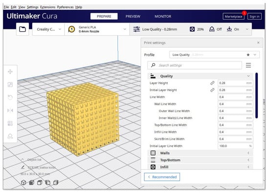 A model of a 30 mm × 30 mm × 30 mm lattice during preprocessing in Ultimaker Cura. The software allows the user to adjust printing parameters for the desired effect.