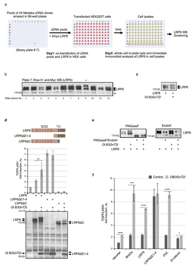 Due to the evolutionarily conserved nature of Wnt signalling, a variety of different cell lines and tools from different species may be used to study the pathway, an approach we have taken advantage of previously [17,45,46,47]. Here, an arrayed and annotated medaka (Oryzias latipes) cDNA library [43] was used as a source of genes to screen for functional regulators of human LRP6 in a human cell line (HEK293T) (Figure 1a). Cells were co-transfected with expression plasmids encoding human LRP6 and pools of 24 cDNA clones prepared from the annotated medaka library and arrayed in 96-well plates ready for transfection. Whole cell lysates were prepared 24 h post-transfection and the overexpressed LRP6 proteins were analysed by SDS-PAGE/Western blot. One of the cDNA pools (96-well plate Nr. 7, well position H9) conferred a clear upshift of the upper LRP6 band (Figure 1a,b). In a second round of screening, the 24 cDNA clones present in pool 7H9 were analysed individually and the medaka B3GnT2-like gene (Ol B3GnT2l, gene ID: 101167058) was identified as the sole modifier (Figure 1c). B3GnT2l is a member of the B3GnT family of glycosyltransferases that plays roles in the N-glycosylation of proteins and, in particular, in the biosynthesis of poly-N-acetyllactosamine chains [48,49,50,51] (Figure S1a).