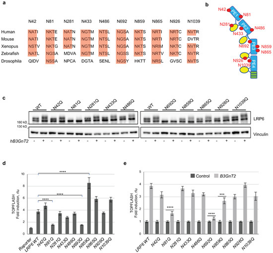 Multiple N-glycan sites of LRP6 are relevant for B3GnT2-mediated LRP6 promotion. (a) Evolutionarily conserved N-glycosylation sites. Red: asparagine (N) residues predicted to be N-glycosylated, with indicated amino acid position above. (b) Schematic model of LRP6 extracellular domain and its N-glycosylation sites. N-glycosylation sites are indicated as red filled circles: PE1 (N42, N81, N281); PE2 (N433, N486); PE3 (N692, N859, N865, N926); PE4 (N1039). PE, β-propeller/EGF-like structural domain. (c) Western blots of lysates from B3GnT2−/− HEK293T cells transfected with indicated hLRP6 constructs (20ng) alone or with hB3GnT2 (2 ng) in 96-well format. (d,e) TOPFLASH reporter assay using lysates of B3GnT2−/− HEK293T cells transfected with indicated hLRP6 constructs alone or with hB3GnT2 shown in (c) in 96-well format. (d) Wnt signalling activity of samples expressing LRP6 alone. Data represent mean ± SD. **** p < 0.0001. (e) Wnt signalling activities of samples expressing LRP6 alone shown in (d) are set as 1 and activities of samples expressing LRP6 and hB3GnT2 are normalised to the corresponding samples expressing only LRP6. Data represent mean ± SD. *** p < 0.001, **** p < 0.0001.