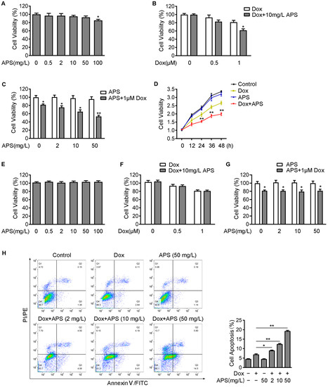 APS enhanced Dox-induced cell death in hepatocellular carcinoma Hep3B cells. Hep3B cells (A) or L02 cells (E) were treated with APS (0, 0.5, 2, 10, 50, 100 mg/L) and analyzed using a CCK-8 assay. In the presence or absence of 10 mg/L APS, Hep3B cells (B) or L02 cells (F) were treated with Dox (0, 0.5, 1 μM) for 24 h, and subjected to CCK-8 detection. Hep3B cells (C) and L02 cells (G) were treated with APS (0, 2, 10, 50 mg/L) in the absence or presence of 1 μM Dox for 24 h, and cell viability was determined using CCK-8 assay. (D) Hep3B cells were cultured with normal medium (control group), 1 μM Dox, 50 mg/L APS and 1 μM Dox + 50 mg/L APS for 48 h and assayed for cell viability every 12 h. (H) Hep3B cells were treated with 1 μM Dox along with or without increasing doses of APS (2, 10, 50 mg/L), and a flow cytometry assay was used to detect the cell apoptosis. Data are expressed as mean ± SEM from three independent experiments. *, p < 0.05, **, p < 0.01.