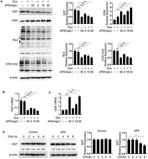 3.3. APS Down-Regulates O-GlcNAcylation through Decreasing OGT Level and Increasing OGA Level in Hep3B Cells