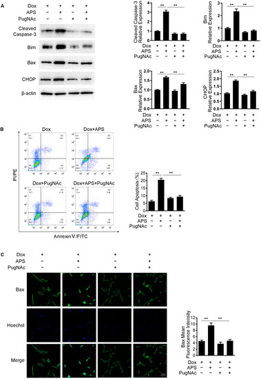 Studies have noted that decreasing the level of O-GlcNAc using inhibitors or genetic knockout of OGT would promote apoptosis in cancer cells [23,24]. We then examined whether APS could enhance apoptosis by decreasing the O-GlcNAc level. As the data mentioned above confirm, the combination of Dox and APS exhibited higher expression of Cleaved Caspase-3, Bim, Bax and CHOP in comparison with Dox treatment alone. However, this effect was attenuated by treatment with PugNAc, an OGA inhibitor, which elevated the intracellular O-GlcNAcylation (Figure 5A). The rate of cell apoptosis was detected using flow cytometry, and we found that the increased apoptosis rate in the combination group was reversed by PugNAc treatment (Figure 5B). Similar to these results, we also used immunofluorescence staining to confirm that the elevated MFI of Bax in the combination group was significantly decreased upon treatment with PugNAc (Figure 5C). These results suggested that the enhancement of apoptosis through the combination of Dox and APS was correlated with the reduction in O-GlcNAcylation caused by APS in Hep3B cells.