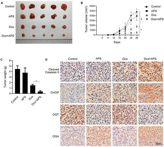 To further confirm the combination effect of APS and Dox on liver cancer growth in vivo, a subcutaneous xenograft tumor model was established with Hep3B cells. Administration of Dox effectively reduced the tumor size and weight compared to control group, and this effect was strengthened by combining with APS. No significant inhibiting effect of tumor growth was observed in the APS group (Figure 6A–C). These data indicated that APS synergistically inhibited tumor growth with Dox in vivo. To determine the expression of Cleaved Caspase-3, CHOP, OGT and OGA in the xenograft tumor in different groups, immunohistochemistry (IHC) analysis was performed. As shown in Figure 6D, in the Dox group, the expression levels of Cleaved Caspase-3 and CHOP were higher than that of the control group. Compared with Dox administration, the expression levels of Cleaved Caspase-3 and CHOP were further enhanced. As compared with the control group, the expression of OGT was decreased and OGA was increased upon APS treatment alone or combination treatment in cancerous tissue. Similar to the in vitro results, these data indicated that APS could potentiate Dox sensitivity, and promote cell apoptosis and the ER stress response in Hep3B xenograft tumors when combined with Dox, and these effects might correlate with the down-regulation of OGT or up-regulation of OGA in tumor tissue.