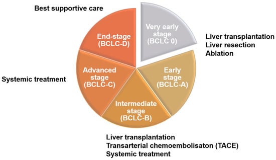 There are many different methods for the staging of liver cancer in clinical practice, including Okuda, Barcelona Clinic Liver Cancer (BCLC), Cancer of the Liver Italian Program (CLIP), Chinese University Prognostic Index (CUPI), Japan Integrated Staging (JIS), and tumor–node–metastasis (TNM), among others. Although the details differ among methods, most are based on the size of the tumor and its metastasis status [11,12]. Clinically, these different staging methods are highly correlated with treatment strategies for liver cancer patients (Figure 1). According to the 2022 BCLC treatment strategy, patient evaluation should take into account both tumor status and performance status (PS) as well as liver function (Child–Pugh score). For early-stage patients (0-A), liver resection or ablation (radiofrequency or microwave) may also be accepted after evaluation for liver transplantation. In intermediate-stage patients (B), besides liver transplantation, patients will be evaluated for transarterial chemoembolization (TACE) and systemic drug therapy, including targeted drugs and immunotherapy. Advanced-stage patients (C), should receive systemic drug treatment first, but other options may be considered after evaluation. As for patients with end-stage liver cancer (D), they can only receive supportive therapy, as various HCC therapies are no longer effective [13].