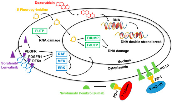 Recently, various drugs have been developed for the treatment of HCC. Pembrolizumab (anti-PD-1 therapy) has shown significant improvements in overall survival, progression-free survival, and response rate for patients with advanced HCC [36]. Ramucirumab (anit-VEGFR-2) has been approved by the FDA as a second-line treatment for HCC in patients with an AFP ≥ 400 ng/mL after initial treatment with sorafenib [37]. There are still many different drugs that have been continuously explored and developed in clinical applications, but the study on drug resistance and biomarkers is relatively insufficient; thus, focus is on the discussion of the traditional drugs.