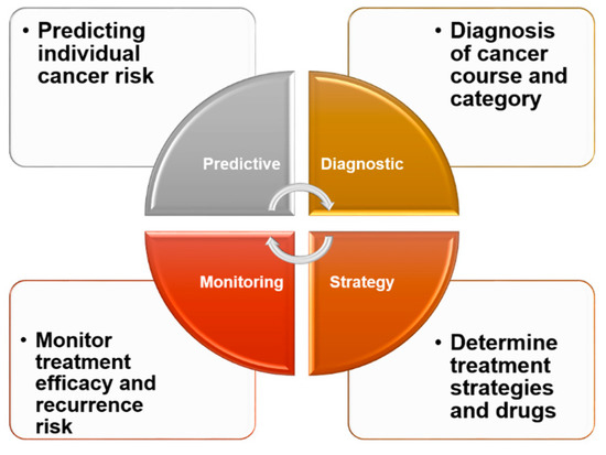 The emphasis of cancer treatment strategies has gradually shifted from surgery to chemical chemotherapy (e.g., doxorubicin) and finally to targeted therapy (e.g., TKI inhibitors, immune checkpoint inhibitors). Advances in cancer biology and sequencing technology have enabled the selection of targeted—and more effective—treatments for individual patients with various types of solid tumor [38,39]. Such evolving treatment strategies will very much depend on the patients themselves or the genes expressed by their tumor cells. Because biomarkers are critical to the rational development of individualized therapeutics (Figure 3) [40], such biomarker-based therapy can be expected to receive increasing attention. In a personalized medicine setting, biomarkers will be used not only to identify risks and monitor cancer, but also to select treatment methods. As the number of models designed to identify and predict biomarker genes capable of identifying drug susceptibility continues to grow, a priority for future research should be the development of new therapies targeting specific pathways involved in the pathogenesis of HCC [41,42,43]. Among the challenges in the clinical diagnosis of liver cancer is identifying biomarkers that satisfy the criteria of specificity, ease of detection (noninvasiveness), and the ability to reflect different pathological phenomena (tumor stage, size, invasion degree, and patient survival rate) [44]. Although still in the research stage, many biomarkers are available for use in evaluating the outcome of different treatments for liver cancer. In a clinical setting, potential targets for biomarker development include AFP-L3 (the Lens culinaris agglutinin-bound form of AFP), PIVKA-II (prothrombin induced by vitamin K absence-II), and DCP (Des-γ-Carboxy Prothrombin), for local treatments such as surgery and TACE; AFP, VEGF, and angiopoietin 2 (ANG-2) for systemic treatments such as TKIs; and inflammation-related factors such as PD1, PD-L1, and PD-L2 for immunotherapy [45].