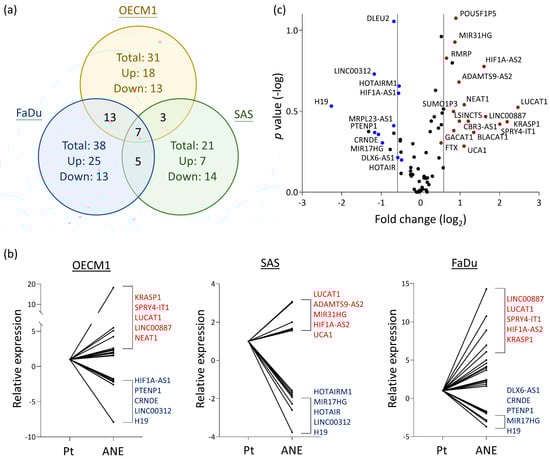 The dysregulated profile of 84 lncRNAs in response to areca nut treatment in three HNC cell lines (OECM1, SAS, and FaDu). (a) Summary of the dysregulated lncRNAs in each HNC cell line with chronic treatment by areca nut extract (ANE). (b) The most significant dysregulated lncRNAs induced by areca nut (ANE) compared to the parental cells (Pt) in each HNC cell line (OECM1, SAS, and FaDu). (c) The volcano plot shows the levels of dysregulated lncRNAs with the average |fold-change| (X-axis) and the p-values (Y-axis) among three HNC cell lines. The red dots represent upregulated lncRNAs (n = 17), and the blue dots represent downregulated ones (n = 11).