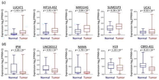 To determine the clinical significance of the 84 lncRNA molecules in HNC, we assessed the differential expression levels between normal (N = 44) and tumor tissues (N = 497) from HNC patients in TCGA-HNSC dataset. With p < 0.05 as the selection criterion, the expressions of 45 molecules were significantly altered (Figure 2a). Figure 2b shows the overall portrait of these molecules in each tissue, with overexpression of 39 lncRNAs and under-expression of six in the tumor tissues (Table 2). Figure 2c presents a few examples of overexpressed molecules that include LUCAT1, MIR31HG, UCA1, HIF1A-AS2, and SUMO1P3. Figure 2d shows the underexpressed lncRNAs: IPW, LINC00312, NAMA, H19, and CBR3-AS1. Thus, we defined a lncRNA panel of 45 molecules dysregulated in patients with HNC.