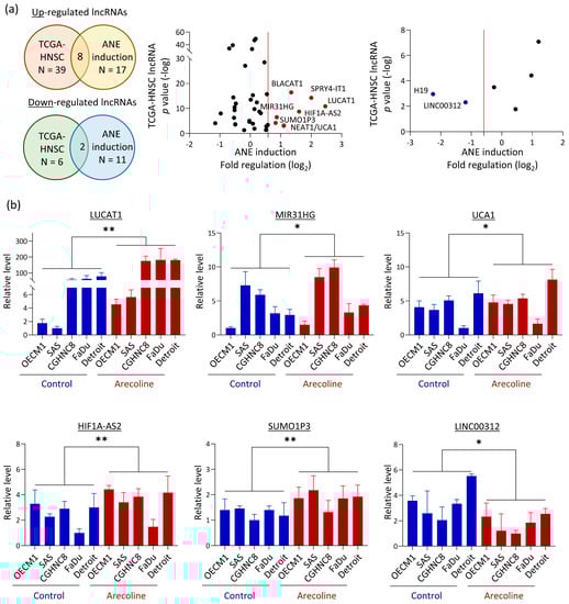 A prior global survey of lncRNAs in oral cancer patients with areca nut chewing habits compared five pairs of tumors and adjacent normal tissues []. An inflammation-related mRNA-lncRNA regulatory network driven by interferon regulatory factors and NF-κB has been identified. However, this study did not directly explore the areca nut-responsive lncRNA and did not further validate the defined molecules. Thus, the associations of the lncRNAs in areca nut-induced carcinogenic mechanisms must be confirmed in future studies. Other relevant studies involving oral fibroblasts showed revealed arecoline induction of three lncRNAs (H19, HIF1A-AS1, and LINC00087), which mediates fibroblastic differentiation or migration [,,]. However, the data were from fibroblasts, limiting their relevance to cancer. To further explore the association of lncRNAs with HNC, we examined the differential expression status of 84 candidate lncRNAs between normal and tumor tissues using TCGA-HNSC data. A total of 45 lncRNAs were differentially expressed in tumor tissues, including 39 overexpressed and 6 underexpressed lncRNAs in the tumors (Figure 2 and Table 2). These lncRNAs represent clinically identified molecules participating in the tumorigenesis of HNC. TCGA-HNSC contains no information related to the areca nut. Thus, we integrated analysis of the areca nut-inducing panel (Figure 1) and TCGA-HNSC tumor panel (Figure 2a) to define a lncRNA signature for areca nut-induced HNC (Figure 3a). A total of ten lncRNAs were identified, including eight upregulated oncogenic and two tumor-suppressive lncRNAs. Six of these lncRNAs were further confirmed to be differentially expressed in the tumors and were induced by arecoline (Figure 3b,c). Recent studies have also reported the involvement of these lncRNAs in HNC, supporting our findings of their roles, including LUCAT1, MIR31HG, UCA1, BLACAT1, NEAT1, and LINC00312 [,,,,,]. Thus, we defined a panel of 10 molecules as the lncRNA signature in areca nut-induced HNC.