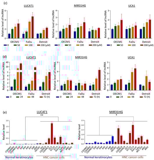 RT-qPCR was performed independently to confirm the lncRNA screening results. The dysregulation level of each lncRNA in response to areca nut was assessed by treating five HNC cell lines with arecoline. The results are shown in Figure 3b. Although various levels were evident in different cell lines, five molecules (LUCAT1, MIR31HG, UCA1, HIF1A-AS2, and SUMO1P3) were consistently upregulated by arecoline, whereas LINC00132 was significantly downregulated. Three lncRNAs (LUCAT1, MIR31HG, UCA1) were further examined for the effect of arecoline by treating cells with serial doses (0~200 μM) or various time points (0~72 h) in three HNC cell lines (OECM1, FaDu, and Detroit). In general, these molecules exhibited up-regulation by arecoline in the dose-dependent (Figure 3c) and time course-dependent (Figure 3d) manners. These results confirmed the genuineness of the screening results. The differential expression of each lncRNA was examined in 12 HNC cell lines and 10 normal oral keratinocytes. The results are shown in Figure 3e. The five lncRNAs upregulated by arecoline were significantly overexpressed in HNC cell lines, while LINC00312, which was downregulated by arecoline, was underexpressed in HNC cells. The findings identify a panel of lncRNA signatures with five oncogenic and one tumor-suppressive features that may contribute to areca nut-induced HNC.