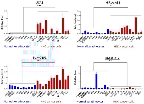 Useful cancer biomarkers should significantly improve the efficacy of disease management. Clinically, cancer biomarkers can be applied in cancer screening, diagnosis, prognosis, monitoring disease progression, predicting therapeutic response, or risk assessment []. Examples are the markers of cancer stem cells in oral cancer, which are associated with the pathological stem-like features of recurrence and metastasis that may predict chemo-drug resistance and treatment efficacy []. As clinical samples, biomarkers can be detected in tissues (biopsy) or circulating fluids (liquid biopsy), such as serum/plasma or saliva. The advantage of tissue biopsy is precisely correlating tumor status in situ, while liquid biopsy presents an overall tumor heterogeneity and involves minimally invasive procedures []. At the molecular level, biomarkers can be categorized as DNA, RNA, protein, or other metabolites. For over a decade, the circulating nucleic acids have been considered valuable biomarkers, for they may be highly elevated in cancer patients []. An example is the miR-196b as a promising salivary cancer marker to detect early HNC and oral precancer lesions with high sensitivity and specificity []. Nevertheless, the role of the novel biomolecular family, the long non-coding RNA (lncRNA), in HNC has yet to be addressed.