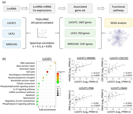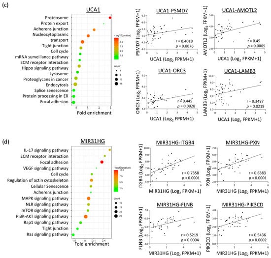 Although lncRNAs may modulate gene expression via various mechanisms, the major function of lncRNAs is to process and stabilize mRNA maturation. Thus, lncRNAs are often positively correlated with their downstream effective genes [,]. To explore the potential functions of our defined lncRNAs, we employed this concept and used bioinformatics strategies to search for downstream effectors of the lncRNA and predict their regulatory mechanisms in HNC cells (Figure 4a). LUCAT1, UCA1, and MIR31HG were examined. Several positively correlated genes were enriched in various tumorigenic pathways by each specific lncRNA (Figure 4b–d).