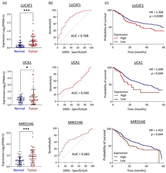 To determine the clinical significance of LUCAT1, UCA1, and MIR31HG in HNC, we evaluated the associations of molecular expression with clinical presentations to assess their predictive power in diagnosis and prognosis using TCGA-HNSC data of the 43 HNC patients with paired normal and tumor samples. As shown in Figure 5a, LUCAT1, UCA1, and MIR31HG were significantly increased in the cancer group (p < 0.05), particularly LUCAT1 and MIR31HG (p < 0.0001).