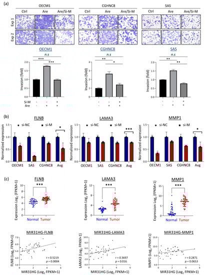 MIR31HG regulates arecoline-induced cellular invasion in HNC cells. The Matrigel invasion assay was performed to analyze the silencing effect of lncRNAs in the regulation of arecoline-induced cell invasion. (a) The effect of invasion ability is modulated by MIR31HG silencing. (b) The expressions of invasion associated genes (FLNB, LAMA3, and MMP1) in response to MIR31HG silencing in three HNC cell lines, as determined by RT-qPCR analysis. (c) The correlative expressions of MIR31HG with three invasion-associated genes. (*: p < 0.05, **: p < 0.01, ***: p < 0.001). si-M, si-MIR31HG; Are, arecoline.
