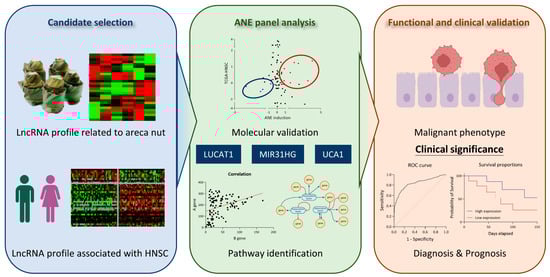 The Cancer Genome Atlas (TCGA) provides a comprehensive genomic library for multiple cancers, including head-neck squamous carcinoma (TCGA-HNSC). Based on this dataset, several lncRNA profiles associated with specific carcinogenic attributes were constructed. These include the effects of alcohol consumption [], human papillomavirus infection [], immunity or tumor microenvironment [,], and their association with prognosis [,,,,]. However, most studies solely analyzed big data without further experimental validation, which may limit the pathological insight of candidate molecules. On the other hand, although the areca nut is a primary carcinogen of HNC in Southeast Asia, the knowledge of lncRNA in areca nut-associated carcinogenesis is very limited. To the best of our knowledge, only one report has mentioned the relevance of lncRNAs in areca nut-induced HNC. Li et al. performed a gene chip analysis of lncRNAs that were differentially expressed between the tumor and the adjacent normal tissues from tongue cancer patients with an areca nut chewing habit []. Although thousands of lncRNAs may establish potential gene regulatory networks, no specific molecules have been identified. A more extensive investigation of lncRNAs in the carcinogenic function of areca nuts leading to HNC is warranted.